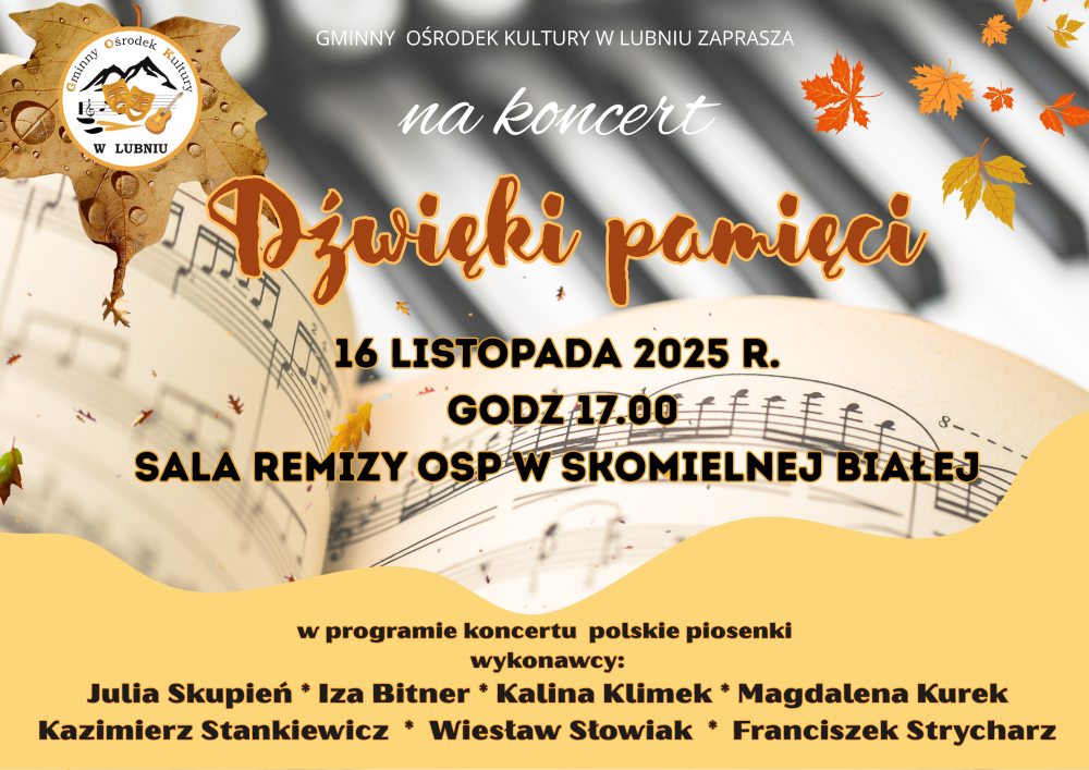 Gminny Ośrodek Kultury w Lubniu zaprasza na koncert pt. „Dźwięki pamięci”. Odbędzie się on 16 listopada 2025 r, w Skomielnej Białej, w remizie OSP. Koncert jest poświęcony nieżyjącym już artystom (wokalistom, muzykom, autorom tekstów), tworzącym